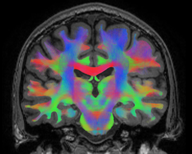 We can use another type of MR imaging to see the white matter tracts in the brain and how they connect the different brain regions together: